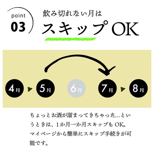 ちょっとお酒が溜まってきちゃった…という月は、マイページで簡単にスキップを設定できます。
