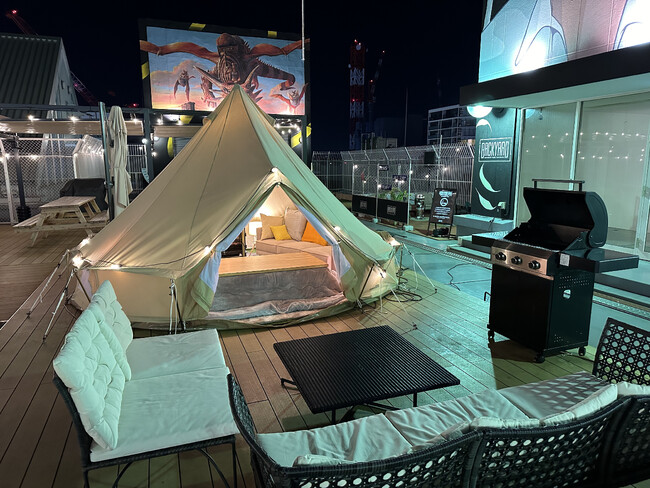 この度はさらなる良質な体験の提供を目指し、都内近郊で非日常空間が体験できる「SKY CAMP AREA」で、グランピングをスタートしました。料金は一律のため、大人数でご利用いただくとよりお得にお楽しみいただけます。テント内には電気ストーブ、こたつをご用意しておりますので、真冬でも十分暖かく過ごせます。また、無料でジェンガやトランプカード、UNOなど時間を忘れるほど没頭できるボードゲーム類も貸し出しいたします。日帰りしやすい横浜駅から徒歩5分の立地で、特別な体験をお楽しみください。