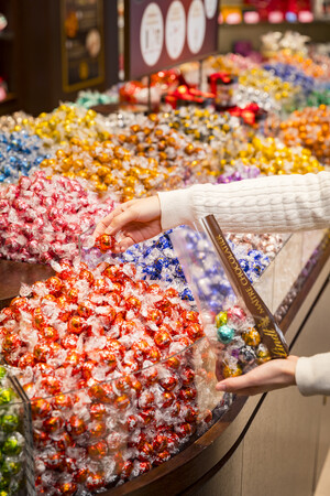 「リンドール」は、なめらかな口どけのフィリングと繊細なシェルの2層構造が特徴のチョコレートです。その贅沢な口どけは食べる人を魅了し、発売から60年以上世界中で愛されています。リンツの直営店では、定番フレーバーと期間限定フレーバーあわせて20種類以上をご用意しており、様々なフレーバーの中からお好きなものをお好きなだけ量り売りで購入できる「PICK&MIX」をお楽しみいただけます。
