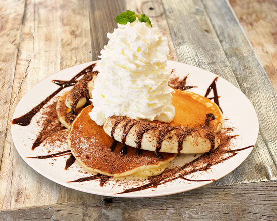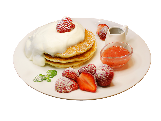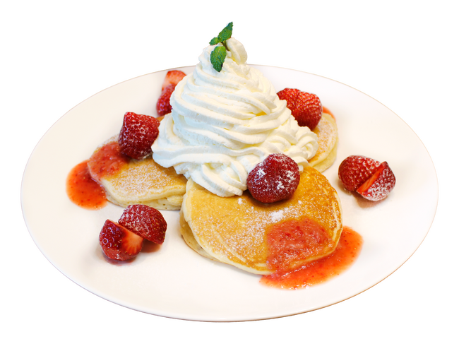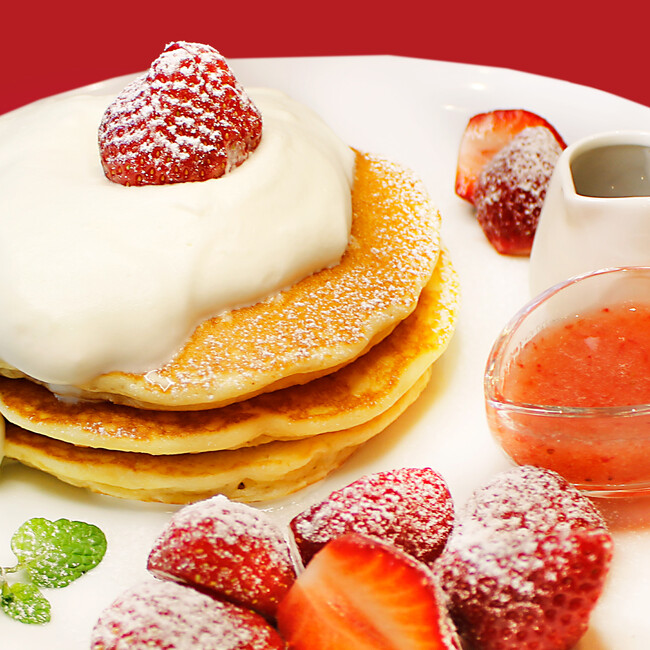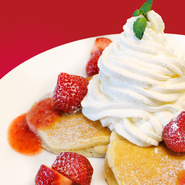 商品説明:福岡県産「あまおう」の旬の味を贅沢に楽しめるパンケーキ。いちごソースとメープルシロップでお好みに仕上げてお召しあがりください。