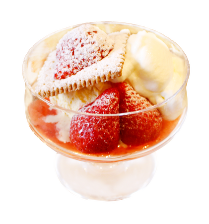 商品説明:バニラアイスに、いちごソースと旬の味が楽しめる「あまおう」を添えた絶妙なバランス。食後のデザートにおすすめ。