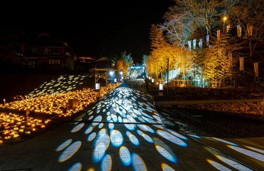 長門湯本温泉で、「金子みすゞの詩」を中心に、詩や童謡に取り上げられる優しくて清らかな世界を視覚化、家族や恋人が、あかりの風景を見ながら「詩」の世界に思いをはせる静かな冬のイベント「音信川うたあかり」がスタートしたのは、2019年2月。音信川を中心に、地元の方々と力を合わせた「地域総出の演出」は当初から一貫したものであり、温泉街の再生に向けた取組を象徴する取組でもあります。