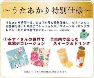 音信川うたあかりに合わせ、西日本鉄道株式会社(西鉄)では、福岡と長門湯本温泉を結ぶ高速バス「おとずれ号」を特別仕様に。車内の演出企画は長門湯本温泉及び界 長門が担い、移動中から音信川うたあかりの世界を体験できる特別な時間を体験いただけます。みすゞさんの世界観を描いた車内デコレーションやスイーツ&ドリンクプレゼンとなど特典付き。