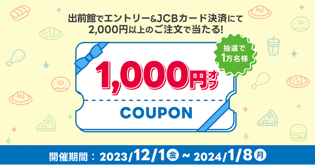 期間中にキャンペーンページからエントリー&対象のJCBカードを利用して『出前館』で2,000円以上の決済をされた方の中から抽選で1万名さまに、次回以降のご注文時にご利用いただける1,000円オフクーポンを後日『出前館』より進呈いたします。