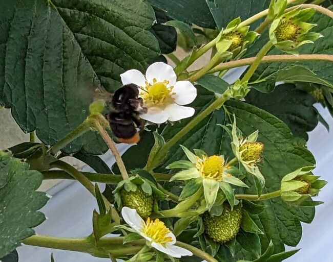 イチゴのビニールハウスでは、働き者のバチさんが一生懸命イチゴの花を受粉しています。バチさんが働きやすいように、農薬をとことん減らしています。だから、安心・安全のイチゴができています。