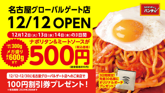 株式会社パンチョ(東京都武蔵野市:CEO 野尻圭介)は、2023年12月12日(火)に「スパゲッティーのパンチョ 名古屋グローバルゲート店」を新規開店いたします。パンチョの愛知県への出店は、2023年7月の名古屋矢場町店に続いて今回が2店目。また、名古屋メシとしておなじみのナポリタンと溶き卵を鉄板で焼いた「鉄板たまご」も名古屋地区限定メニューとしてラインナップします。オープニングキャンペーンとして、12月12日(火)から3日間はナポリタン&ミートソースの500円SALE、各日3日間先着30名にオリジナルポーチをプレゼント、さらに12月30日(土)までご来店の方に100円割引券を進呈します。昔懐かしい味わいとボリューム、トッピングでカスタマイズする楽しさを愛知・名古屋のより多くのみなさまに体験してもらい、「改めてナポリタンはうまい」と実感いただける機会を提供してまいります。