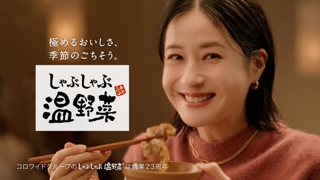 TVCM第2弾は「素材にこだわる 冬」篇と題し、全国からプロが厳選した黒毛和牛、農家さんから仕入れた新鮮な旬の野菜など、温野菜のこだわりの食材について紹介しています。このCMに出演するのは、「鮮度にこだわる 秋」篇に続いて現在ドラマや映画などで活躍する女優の松本若菜さん。TVCMでは、松本さんがたまり醤油と黒糖の「すき焼きだし」で、こだわりのお肉とお野菜を堪能していただきます。