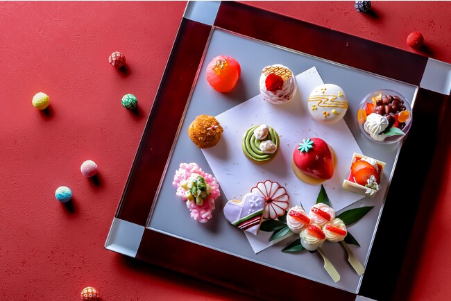 【スイーツ】苺のムース/抹茶とミルクチョコのタルト/金柑マカロン/黒蜜とメープルシロップのあんみつ/ラズベリーモンブラン/ガトーフレーズ/苺と白餡クリームの白玉団子/はんなりアイシングクッキー(2種)