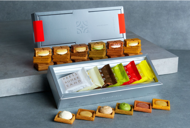 通常はその地域でしか手に入らない限定フレーバー全種と、プレスバターサンドの定番を詰め合わせた記念商品。バタークリームとバターキャラメルの2層仕立ての定番バターサンド、北海道れん乳とうきび、栗、宇治抹茶、檸檬、あまおう苺の6種を一度に味わえる贅沢なセット。プレス機をイメージしたインダストリアルなパッケージからも、特別感を感じられます。