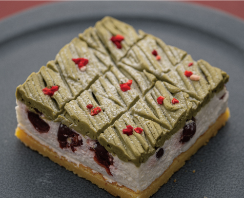 ビスキュイ生地にホイップクリームを重ね、キルシュで香りづけしたピスタチオクリームを合わせました。中にしのばせたキルシュ漬けのグリオットチェリーがアクセント。※取り分け用のヘラ付き。