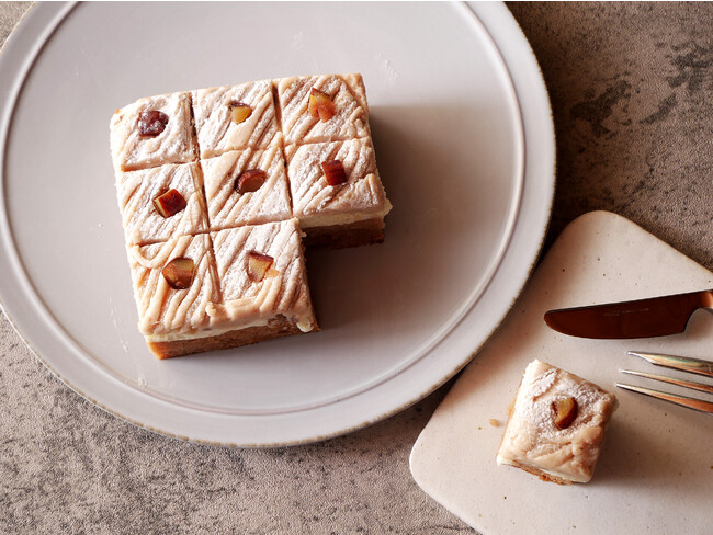 鎌倉レ・ザンジュがお届けする”シェアするモンブラン”。栗のしっとり生地にホイップクリームと渋皮栗を重ね、ラム酒で香りづけしたマロンクリームを合わせました。※取り分け用のヘラ付き。