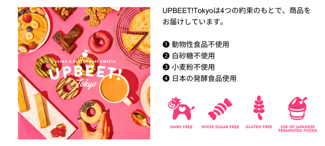 「毎日や人生を"ワクワク=Up beat"させるヴィーガンスイーツを届けたい」というミッションを掲げ、こだわりの100%植物性食材から誕生したヴィーガングルテンフリースイーツ。