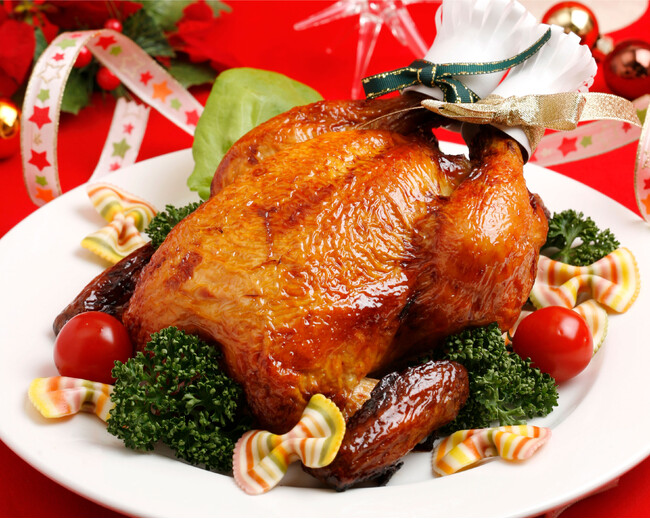 国産鶏を1羽丸ごと使用した、ジューシーで旨味たっぷりのクリスマスチキン。