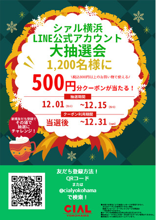 CIAL横浜LINE公式アカウントに友だち登録していただいた方の中から、抽選で1,200名様に、税込800円以上でご利用いただける「500円分のLINEクーポン」をプレゼントいたします。