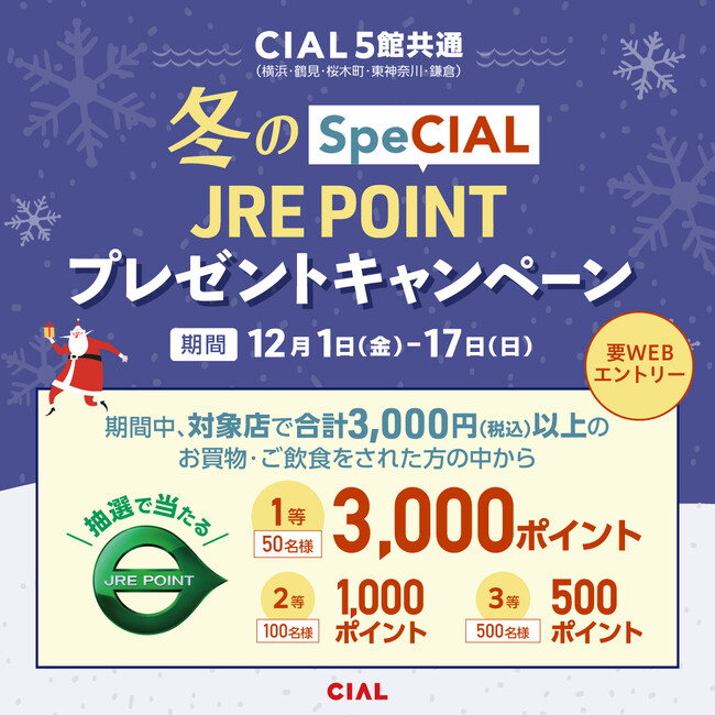 JRE POINTサイトにWebエントリーのうえ、CIAL5館(横浜・鶴見・桜木町・東神奈川・鎌倉)で期間中合計3,000円(税込)お買い物・ご飲食された方の中から、抽選で合計650名様に総額50万ポイントをプレゼント!