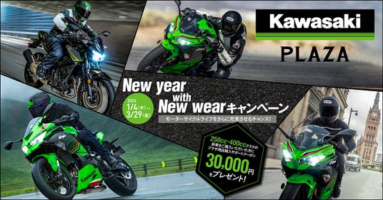 株式会社カワサキモータースジャパン(本社:兵庫県明石市、代表取締役社長:桐野 英子)が展開するカワサキプラザネットワークでは、期間中に対象モデルをお買い上げのお客様に、3万円分のカワサキプラザ用品購入サポートクーポンをプレゼントする「New year with New wear キャンペーン」を実施いたします。