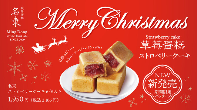 8月の発売開始以来大人気のパイナップルケーキに続く第二弾、台湾カステラの名店、名東が手掛ける特製のストロベリーケーキを、12月2日(土)より、店頭・オンラインショップにて販売開始いたします。この季節だけのクリスマス仕様の特別な限定パッケージでの販売となります。
