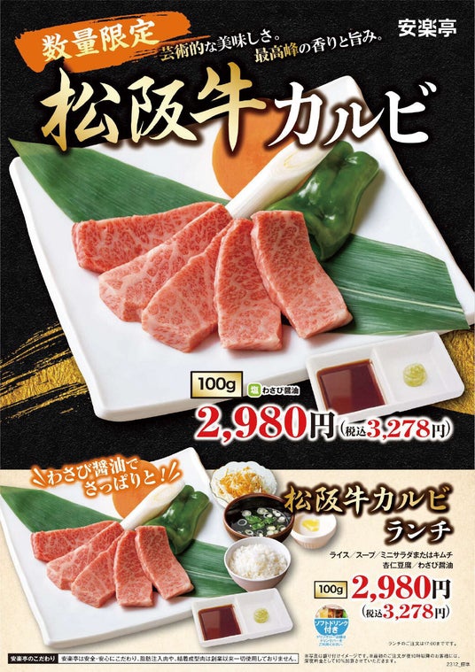 株式会社安楽亭(本社:埼玉県さいたま市、代表取締役:柳 先)は、安楽亭、七輪房、からくに屋の限定店舗にて、和牛の最高峰「松阪牛」を、焼肉単品とランチセットで2023年12月27日(水)より販売開始します。