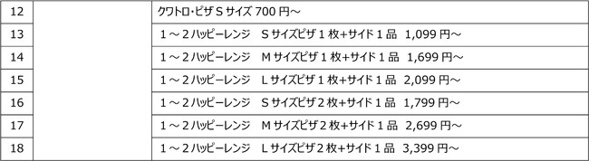 ※「クワトロ・ピザSサイズ700円」は、1ハッピーレンジSサイズピザの価格です。Mサイズへの変更は+300円、Lサイズへの変更は+600円、2ハッピーレンジのピザは+200円、3ハッピーレンジのピザは+300円、4ハッピーレンジのピザ+400円でアップグレードを承ります。