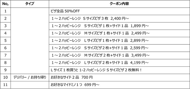 ※1~4ハッピーレンジ:ピザの種類やトッピングの違いにより4つの価格帯を設定しています。
