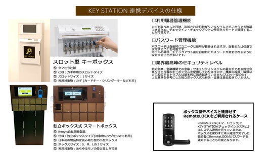 KEY STATIONの一部の機能として物理キーをそのままボックスに入れることにより、ホテルのフロント業務である予約管理・チェックイン・カギの受け渡し・チェックアウトまでを無人で完結できます。