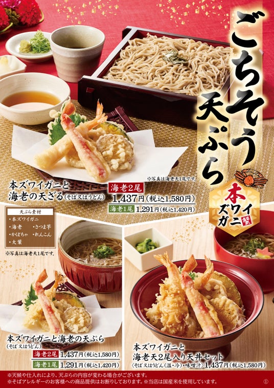 家族亭では、年始より「本ズワイガニと海老の天ざる」を継続販売いたします。
