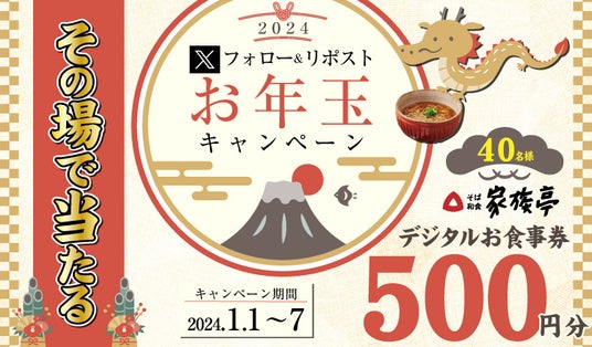 株式会社家族亭(本社・大阪府大阪市、代表取締役社長・坪山 憲司)が運営するそば和食チェーン「家族亭」は、2024年1月1日(月)~1月7日(日)の期間に「家族亭デジタルお食事券500円分」が40名様にその場で当たる家族亭お年玉Xキャンペーンを開催致します。家族亭の公式Xをフォローし、キャンペーンポストをリポストすることで参加ができ、その場で結果が分かります。「家族亭デジタルお食事券」は店内飲食、テイクアウトでご利用いただけます。