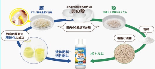 割卵業者から回収された卵殻は、その後自社設備にて卵殻と卵殻膜に分離されます。卵殻膜は液体肥料の原料として使用されるわけですが、卵殻膜を採取した後の卵殻も製品のボトルに配合することで、石油由来の樹脂使用量を削減しております。