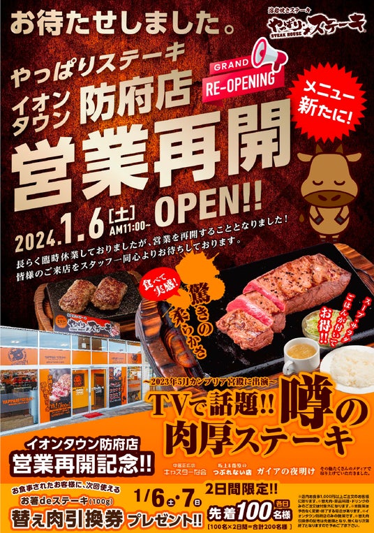 ■ついにやっぱりステーキイオンタウン防府店が2024年1月6日営業再開!