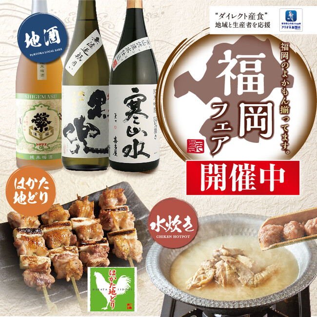 サクッとした歯切れと噛むほどにあふれる旨味が高く評価されている「はかた地どり」や、刺身にすれば食べる芸術と評される「フグ」、気候と豊かな土壌に恵まれた八女地区からは「キウイフルーツ」など、そして福岡の美味しい食を支える「日本酒」を各店舗でお楽しみください。