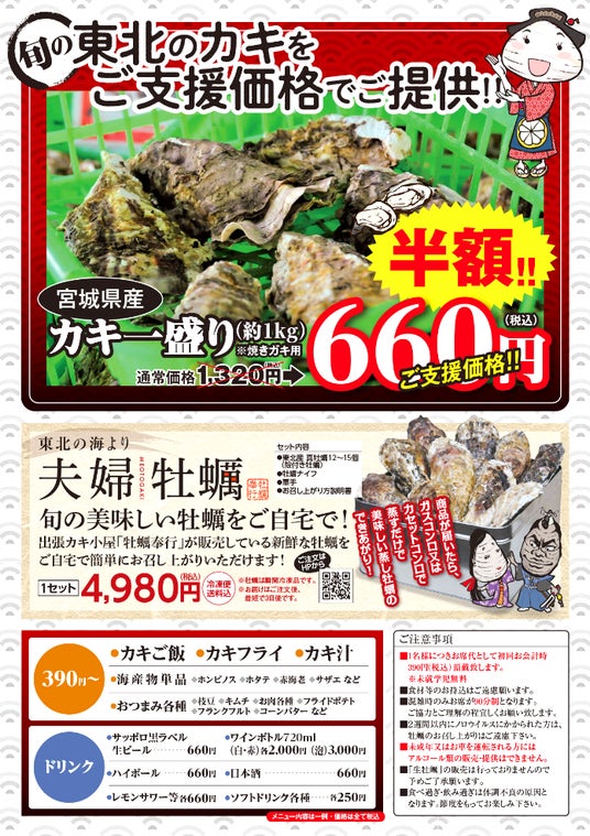 震災後に販売不振に悩まされた宮城県石巻市の養殖業者らを支援しようと立ち上げた「かき小屋実行委員会」が2012年から全国各地で開く。宮城県産牡蠣をはじめとする牡蠣のPRと地域の賑わいづくりに貢献している。牡蠣は「石巻産殻付き真牡蠣」(約1キロ=殻付き4~6個)通常1,320円を東北復興支援価格として1盛り660円で提供するほか、「仙鳳趾産牡蠣」(約4個)「瀬戸内産牡蠣」(約6~10個)(以上1,200円)を用意。
