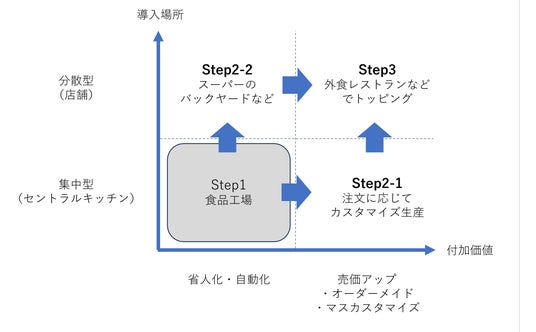 さらには、ライン生産型での前提となっている「1か所の工場・ラインで集中的に生産する」ことが条件ではなくなるため、例えば、スーパーのバックヤードの惣菜盛付現場等に設置し、売り場に近い現場でも省人化・自動化効果を見込むことができます。これにより、店舗側での効率化に加えて、工場・店舗の役割分担・配送ネットワークの見直しなど、様々な経営上の自由度が加わり、食品小売・メーカに対する付加価値創出に発展させることも視野に入れています(Step2-2)。