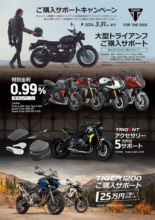 今回、新たに大型バイクの初購入を検討されている方に向けた「大型トライアンフご購入サポート」を開始。そして好評な「0.99%特別低金利キャンペーン」を開始。その3気筒の中でもルックス、性能、価格と全てが揃ったオールラウンダー、Trident 660 のご購入時に使える「アクセサリー5万円分サポート」を登場させました。さらに、好評につき「Tiger 1200新車ご購入サポート」も継続と、充実のサポートです。