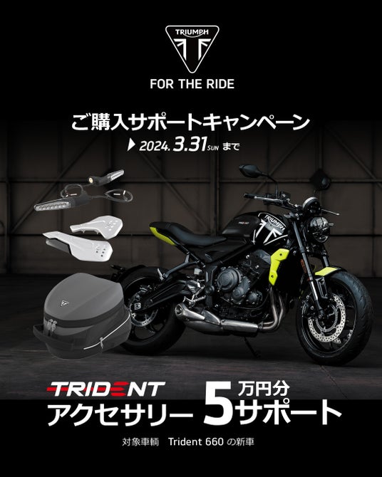 内容:キャンペーン期間中、全国のトライアンフ正規販売店にて対象のTrident 660をご成約、且つご登録されたお客様に「5万円分(税別)のアクセサリーをプレゼント」します。