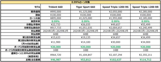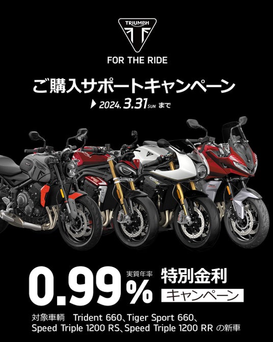 内容:キャンペーン期間中、全国のトライアンフ正規販売店にて対象車両をご成約、且つローン契約完了していただいたお客様に、「0.99% 特別金利ローン」をご提供します。