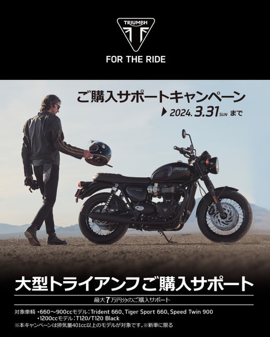 内容:トライアンフではじめて大型バイクをご成約いただいた方を対象に、最大7万円分の特別購入サポート