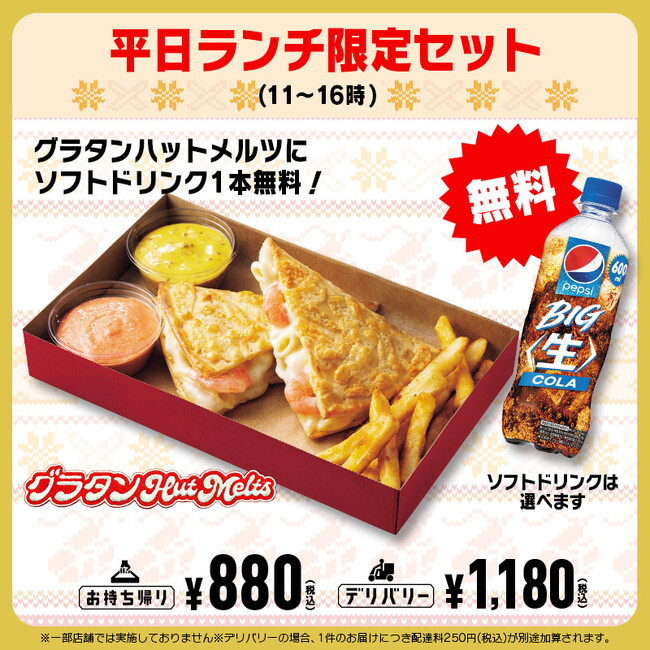 物価上昇が食卓に影を落とす中、食卓のピンチを救う!?超おトクなセットメニューが2024年1月5日(金)~3月11日(月)の間登場!なんと平日ランチなら、グラタンHut Meltsにソフトドリンクが1本無料でついてきます。平日ランチ限定セットで平日の仕事のおともやお昼ご飯、おやつにさくっとおトクにご利用いただけます。