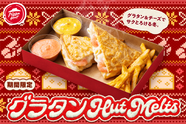 ピザハットは、冬に大人気な定番グルメ、グラタンと大好評をいただいている“おひとりさまピザ”「Hut Melts」が融合した、サクサクとろ~りな新商品「グラタンHut Melts」を開発しました。「ハニーマスタードソース」「明太子ソース」の2種類のソースで味変を楽しむこともでき、これまでにない新形態「ディップできるグラタン」としてお楽しみいただけます。サクサクのクリスピータイプの生地に、とろ~りチーズ、そしてさらに濃厚なグラタンソースが合わさった背徳感たっぷりなメニューはやみつきになること間違いなしです。お正月のおせちや和食以外の物を食べたくなった頃に、ピザハットの新グラタンメニューをお楽しみください。ピザハットがこの冬を、あったメルツ。