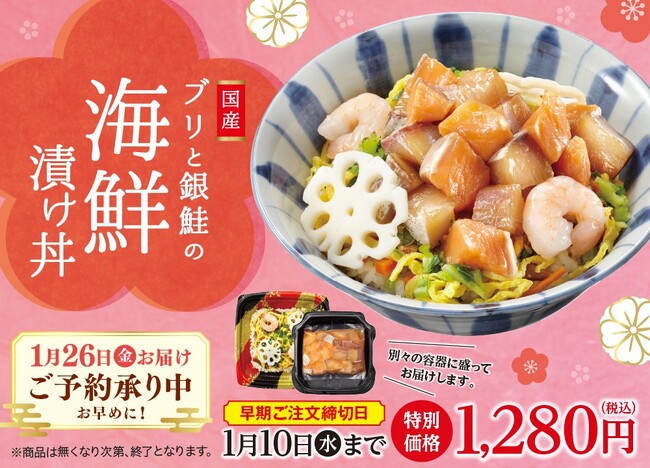 「ワタミの宅食」では季節や行事を感じていただけるよう、数量限定で特別弁当の販売を行っており、2023年度は年間4回の販売を予定しております。今回販売しております「海鮮漬け丼」は、1月26日(金)にお届けをします。国産のブリと銀鮭を使用し、エビやレンコン・錦糸玉子などと一緒に召し上がっていただく、新春にぴったりの商品です。「ワタミの宅食」では、日々の高齢者の食生活をサポートするだけでなく賑やかな食卓も提供してまいります。