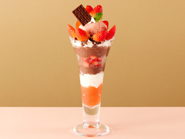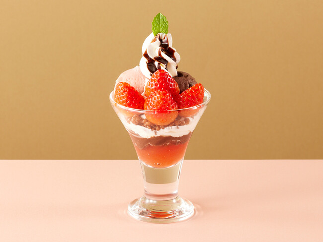 旬のいちごをお手軽にご堪能いただけるミニパフェです。フレッシュないちごはもちろん、ストロベリーゼリーやストロベリーシャーベット、チョコプリン、チョコアイスを使用し、満足感たっぷりの一品に仕上げました。