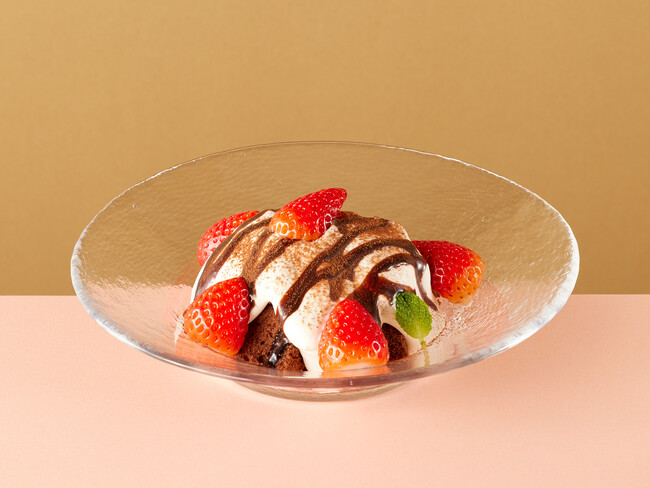 フレッシュないちごをはじめ、ストロベリーゼリーやフローズンストロベリーなど、様々ないちごの味わいをお楽しみいただける一品。いちごの味わいを引き立てるのは、定番の“チョコレート”です。チョコプリンとチョコスポンジの程よい甘み、ホワイトチョコプリンのミルキーな味わいがいちごの甘酸っぱさにアクセントを加えます。別添えの追いチョコソースは、お好みのタイミングでかけていただき、心ゆくまで“ストロベリー×チョコレート”のマリアージュをお楽しみください。