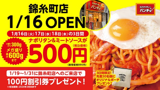 株式会社パンチョ(東京都武蔵野市:CEO 野尻圭介)は、2024年1月16日(火)に「スパゲッティーのパンチョ 錦糸町店」を新規開店いたします。オープニングキャンペーンとして、1月16日(火)から1月18日(木)までの3日間はナポリタン&ミートソースの500円SALE、3日間各日先着30名にオリジナルポーチをプレゼント、さらに1月19日(金)から1月31日(水)までご来店の方に100円割引券を進呈します。昔懐かしい味わいとボリューム、トッピングでカスタマイズする楽しさを多くのみなさまに体験してもらい、「改めてナポリタンはうまい」と実感いただける機会を提供してまいります。