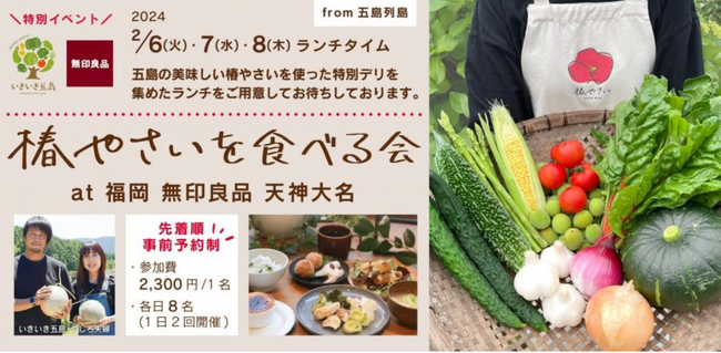 長崎県五島市・福江島で農作物の栽培・販売をしている株式会社いきいきファーム(五島市・代表:八代侑紀)が運営する「いきいき五島」は、五島の椿(つばき)の油粕から作る自家製肥料や、五島の海水を使用して育てたオリジナル野菜ブランド「椿やさい」を使ったランチメニューを提供する『椿やさいをたべる会』を、Cafe&Meal MUJI天神大名にて2024年2月6日~8日の3日間に、各回8名(全48名)限定で特別開催いたします。https://tubakiyasaifukuoka.peatix.com