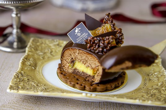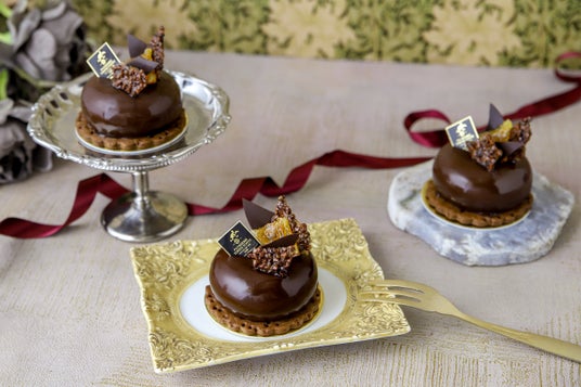 つやつやと光るチョコレートの中は、ミルクチョコキャラメルムースとオレンジクリーム。ほんのりスパイスを効かせたビスキュイやサブレショコラとあわせてバランス良く仕上げました。