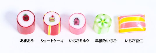 今年のいちごミックスは、デザイン・フレーバー共に一新しました。「ショートケーキ」や「いちご杏仁」などキャンディでは中々味わうことのできないユニークな味に加えて、「牛乳パック」や「いちごの花」といった可愛いデザインのキャンディをミックスしています。