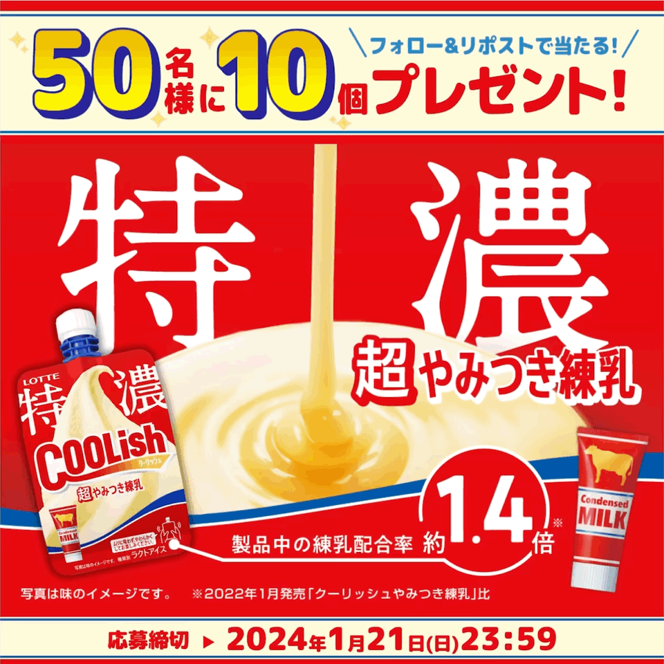 「クーリッシュ 超やみつき練乳」の発売を記念して、クーリッシュ公式Xアカウントでプレゼントキャンペーンを実施します。ぜひご参加ください!
