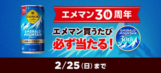 キャンペーン期間中、「Coke ON」アプリで「ジョージア エメラルドマウンテンブレンド」をはじめとした対象製品を購入すると「Coke ON」ドリンクチケット(10万名様)あるいは、エメマン30周年限定スタンプが必ずもらえるキャンペーンを実施します。
