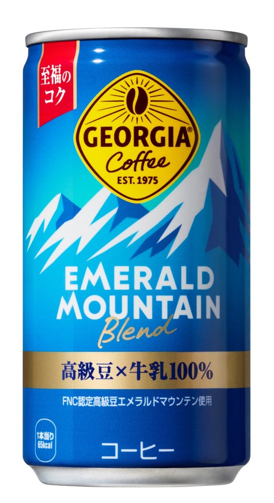 1994年に誕生した「ジョージア エメラルドマウンテンブレンド」(通称:エメマン)は、厳選された高級豆"エメラルドマウンテン豆"と国産牛乳の王道バランスを味わうことができます。エメマンは、コロンビアの壮大な自然と丹精込めた人の手によって育てられ、手摘みで収穫されたコロンビア産コーヒー豆のうち上位3%だけが認定※4される「エメラルドマウンテン豆」を使用しています。また、粉乳を使わず国産牛乳を100%使用することで、心地よい飲み心地を実現しています。製品のパッケージデザインでは、発売当時から変わらない特徴的な山のイラストと特徴的なブルーの色合いを取り入れ、23年5月からジョージアの新しいブランドロゴを採用することにより、製品の連動性と親和性を強化しています。