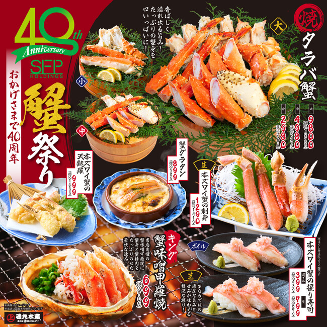 今年、SFPホールディングス株式会社は、おかげさまで創業40周年を迎えます。そして「磯丸水産」は、 1号店開業より15周年となります。今年は、周年記念として様々な企画を実施してまいります。海鮮居酒屋「磯丸水産」をはじめ多数の居酒屋を運営する SFP ホールディングス株式会社(本社:東京都世田谷区 代表: 佐藤誠)は、2024年1月9日(火)より「蟹祭り」を開催いたします。