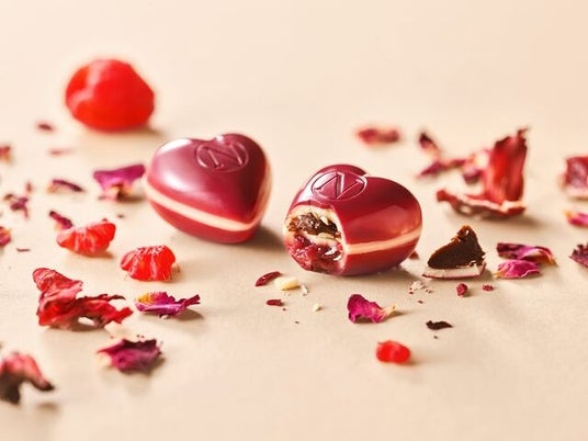 赤い色のホワイトチョコレートのハートの中には、ローズフレイバーのガナッシュが詰まっており、ラズベリーとハイビスカスの甘い香りを引き立てています。